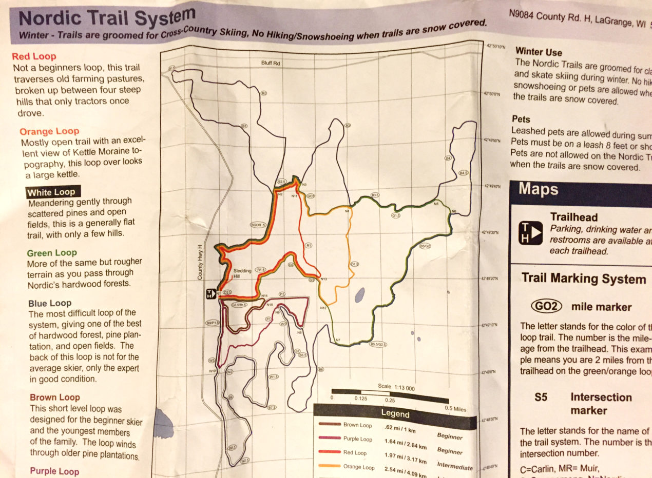 I am an avid hiker and yesterday I took advantage of the sunny and mild weather here in Wisconsin to wander a bit through the Kettle Moraine State Forest (it is very strange and disappointing not to have snow to ski or snowshoe on). So I grabbed this paper map at the ranger hut and hit the trails! As I like to say, “Maps are everywhere!” and this map did a great job of using colors to provide a view of all of the paths available to me. “Where am I?” “Where do I want to go?” “How far is it?” These are all questions maps aim to answer. Though sometimes it’s fun to just stroll around without a plan, maps are there to give us the choice to follow, or not. Where will you wander in the coming New Year? Wherever it is, I’m sure there will be a map there to help guide you!