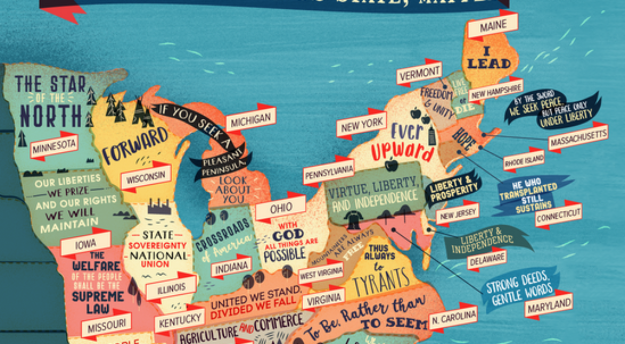 “The Star of the North”…”She Flies With Her Own Wings”…”It Grows As It Goes”…”To Be, Rather Than To Seem.” These are not Shakespearean quotes, but rather just a sampling of state mottos. A motto (derived from the Latin muttum, ‘mutter’, by way of Italian motto, ‘word’, ‘sentence’) is a phrase meant to formally summarize the general motivation or intention of an individual, family, social group or organization. (Source: Wikipedia.com) Every state in our great union has it’s own unique motto, and as you might expect, someone put them all on a map! Click here to view this lovely illustrated map and explore the interesting range of state mottos.