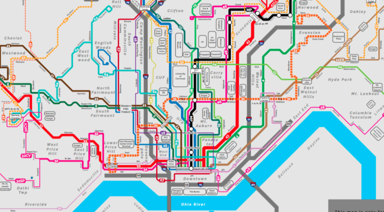 “In the world of public transit, though — where ridership is on the decline, not just for Cincinnati Metro but for systems all across the country — the craft of map design is becoming more important than ever. The “Better Bus Map” is just the latest in the coalition’s grassroots efforts to make Cincinnati Metro more user-friendly. The proposed map effectively does a lot of the planning and logistical work navigation technologies like Google Maps or transit apps do — just without requiring a mobile device to do it. “Not everyone can use these apps,” says map designer Mark Samaan of the Better Bus Coalition. He has made the map printable in sizes up to 40″ by 48″, and he hopes to see them start popping up at destinations around town. He also would like to see a map like his at Metro bus shelters. (Source: wcpo.com)