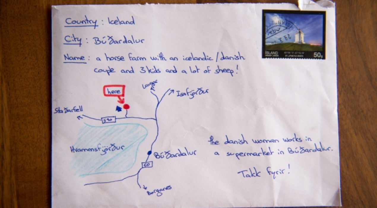 A tourist who had visited a horse farm in Iceland wanted to send a postcard to thank the woman and kind family who lived there. She didn’t know the exact address but she did know a few clues: “Country: Iceland. City: Búðardalur. Name: A horse farm with an Icelandic/Danish couple and three kids and a lot of sheep!” She also knew that the woman worked in the local market. So before leaving the Icelandic capital of Reykjavík, she relied on her memory of the place and quickly drew a map of the farm’s location on the envelope. And it worked — the letter arrived as mapped! Apparently this is not a completely unique occurrence there, as only 300,000 or so people live in an area the size of Ohio. (Source: BBC.com)