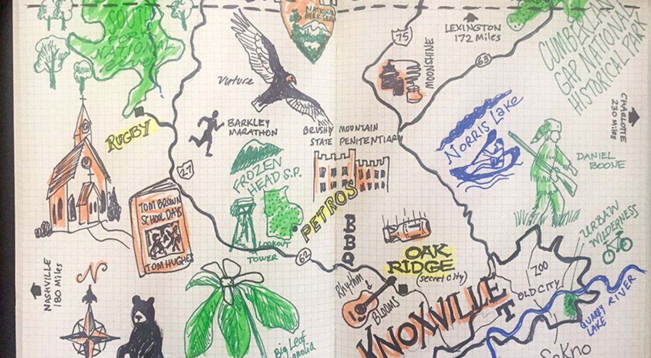 I just returned from a 5-day whirlwind press tour of middle eastern Tennessee. The trip encompassed a wide variety of activities, but my primary focus was on the natural beauty and outdoor recreational opportunities in the region. I took plenty of notes each day and at the end of my visit I used them to sketch out this rough map to highlight some of the memories I made along the way. It’s a visual record of the experience, one that will come in handy when I get around to creating a proper illustrated map. If you like American history, bluegrass music, excellent BBQ, wilderness adventure and some of the friendliest folks around…I highly recommend a visit to the Volunteer State!!