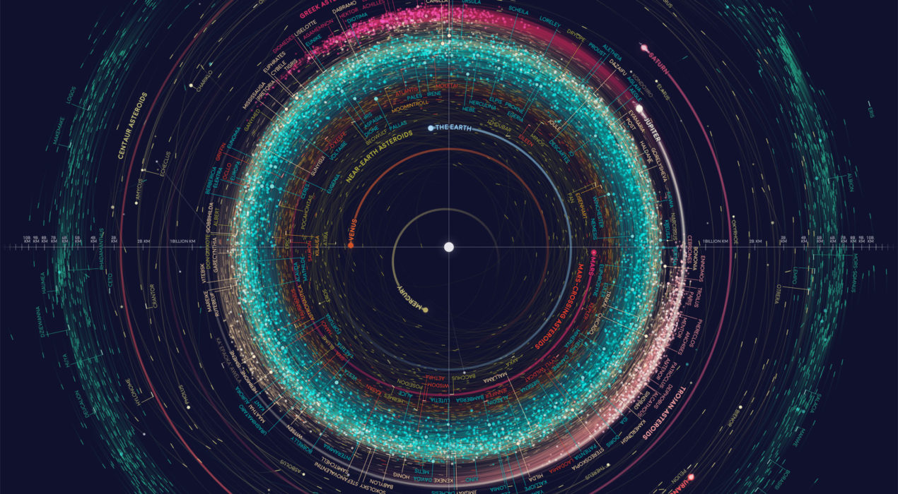 Mesmerizing…Cool…Ethereal…that’s how I would describe this unique map of our Solar System “which shows the orbits of more than 18,000 celestial objects — including about 10,000 asteroids and 8,000 other objects in the system. The map was created by Eleanor Lutz, a Ph.D. candidate in biology at the University of Washington. The map shows each asteroid at its exact position on New Year’s Eve in 1999.” “I think the most unusual part of this map is the logarithmic scale — a mapping technique that can show both the inner asteroid belt and the furthest asteroids in the Kuiper Belt on the same map,” Lutz tells MNN. “I also mapped the positions of 18,000 asteroids, which is more than what is usually included in textbook diagrams of the solar system.” [Source: MNN.com]