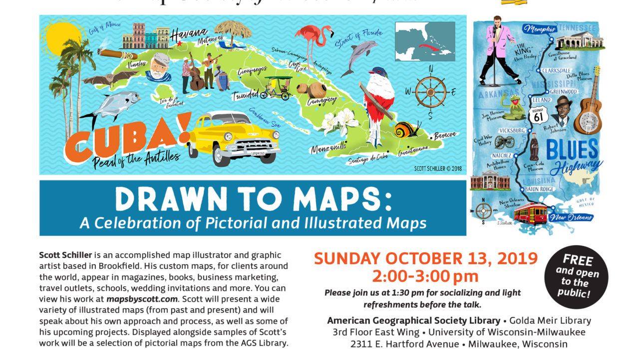 I am honored and excited to be a guest speaker at the American Geographical Society Library’s fall series hosted by The Map Society of Wisconsin! On Sunday October 13, 2019, from 2-3:00 pm, I will be presenting a talk titled “Drawn to Maps: A Celebration of Pictorial and Illustrated Maps.” I will be showing a wide variety of maps, from past and present, and will be speaking a bit about my own approach to creating custom illustrated maps for clients around the world. The event is free and open to the public. If you are near the Milwaukee area I invite you to join me for a fun hour celebrating the magic of maps!