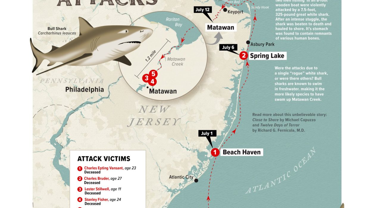 I was inspired to create this map after reading the book, Close to Shore, by Michael Capuzzo, based on the incredible true story of the New Jersey shark attacks of 1916. All but one of the five attacks were fatal. The only other map I found online was lacking in detail and character, so I decided to make one myself. I wanted to highlight the timeline and locations of each of the incidents, with a better view of the region around Matawan, where a shark traveled more than a mile up a shallow muddy creek. I illustrated two shark species, the white and the bull, because (even to this day) there is debate about which of the two, or both, were responsible for the attacks. Bull sharks are known to swim in fresh water, making it the most likely suspect in the Matawan attacks. After a giant great white was captured and killed on July 14, there were no more attacks. Note: though these shark attacks were gruesome in nature, my map is not intended to be sensationalistic or to malign sharks. Rather, I simply felt a better map was needed to represent these historic events. Personally, I have profound […]