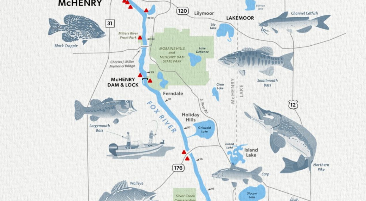My client needed a custom map to print and market to boaters and anglers who frequent this portion of the river between the towns of Fox Lake and Algonquin. The map can be used with or without illustrations, but I think the fish with ID labels make it more visually appealing and informative. This is an unfinished draft — it still needs the list of business names to go with the red locator triangles along the route. I can envision a set of maps like this one that would cover the total length of the Fox River. The Fox River flows for 115 miles southward from its headwaters in Waukesha, Wisconsin to its confluence with the Illinois River in Ottawa, Illinois. It is one of the most versatile bodies of water to fish in Illinois, with 13 dams and over 100 public access points, making it very popular for fishing. The waters around the McHenry Lock & Dam provides provides more walleye than any other spot on the river and is a prime area for channel catfish, white and yellow bass, and crappie