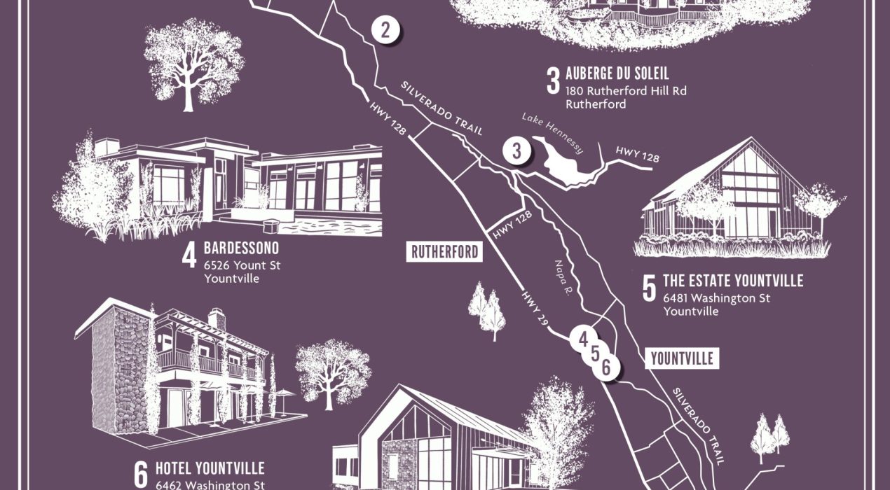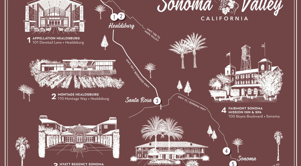 “At only 30 miles in length and 5 miles across at its widest point, California’s Napa Valley is a unique wine-growing region with a complex tapestry of vineyard locations that possess unique, individual personalities through soil and climate.” [Source: napavintners.com] Here I’ve drawn a simple line map of the major roads weaving throughout the valley, from Calistoga in the north, through Rutherford in the central valley, to the town of Napa in the south. The valley has around 400 wineries, as well as a wide variety of luxury resorts, hotels and spas. My client requested I also include detailed illustrations of 7 different properties they associate with.