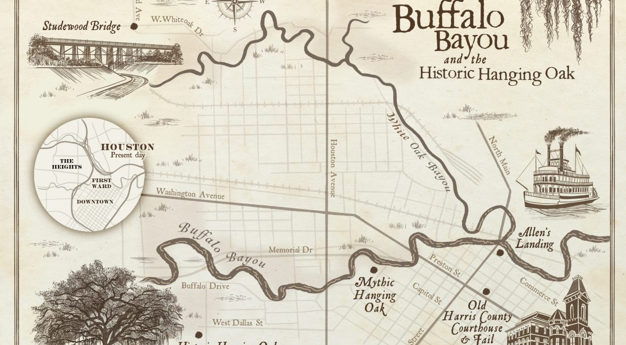 Illustrated map of area where Buffalo Bayou and White Oak Bayou meet, the historic location of the founding of Houston, Texas. Commissioned for a forthcoming non-fiction book by Poseidon Publishing, LLC.