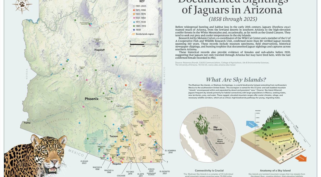 Jaguars once roamed much of Arizona, even as far north as the Grand Canyon. Today, in spite of illegal hunting, habitat loss, a human population explosion and more than 370 miles of border wall, jaguars still wander into the state, but not much farther than just north of the US-Mexico border. The most recent sighting of a jaguar in Arizona, named “Cinco”, was in December 2025. In this map I plotted the historic documented sightings of this magnificent cat, to better visualize the relationship between those locations with what are known as “sky islands.” To understand how and why jaguars travel into Arizona we first need to appreciate the importance of those sky islands, which is why I added the locator map and small infographic. All illustrations are my own. To learn more, I highly recommend reading “Heart of the Jaguar: The Extraordinary Conservation Effort to Save the America’s Legendary Cat,” by James Campbell (Norton Publishing © 2025). It was this book that inspired this map. Available on Amazon.