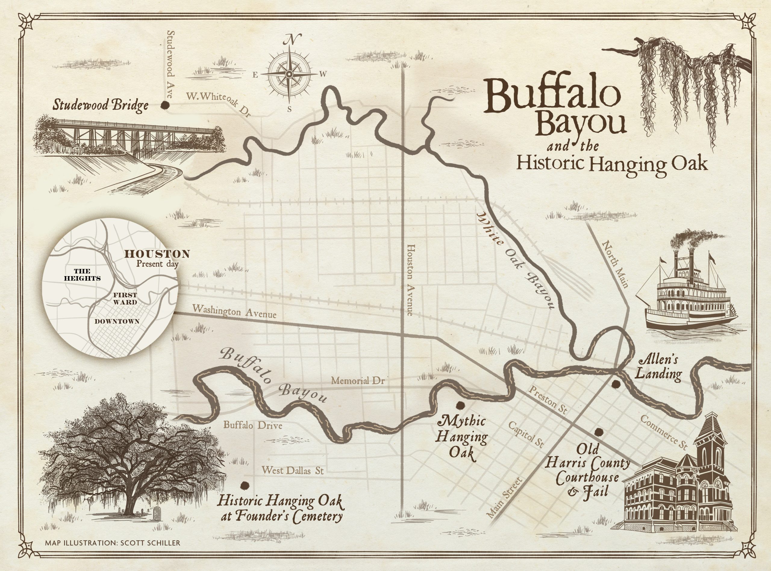 Illustrated map of area where Buffalo Bayou and White Oak Bayou meet, the historic location of the founding of Houston, Texas. Commissioned for a forthcoming non-fiction book by Poseidon Publishing, LLC.