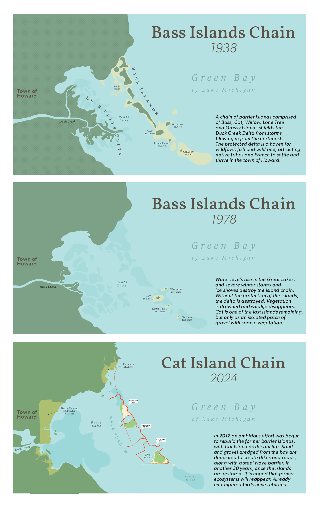 These three maps show a 75-year span of this region: 1) the former barrier islands and delta, 2) the effects on the islands from rising lake levels and severe storms, and 3) the progress of the rebuilding process (as of 2024).