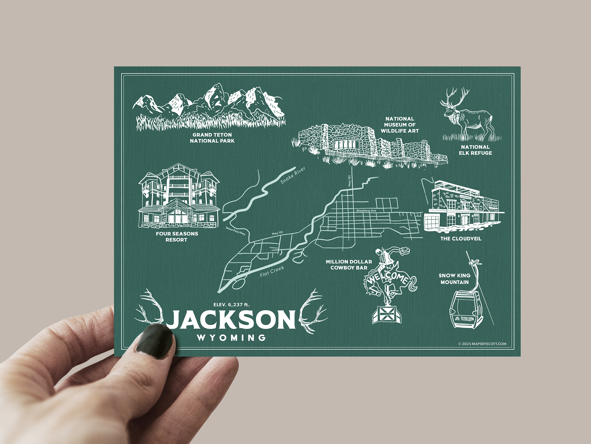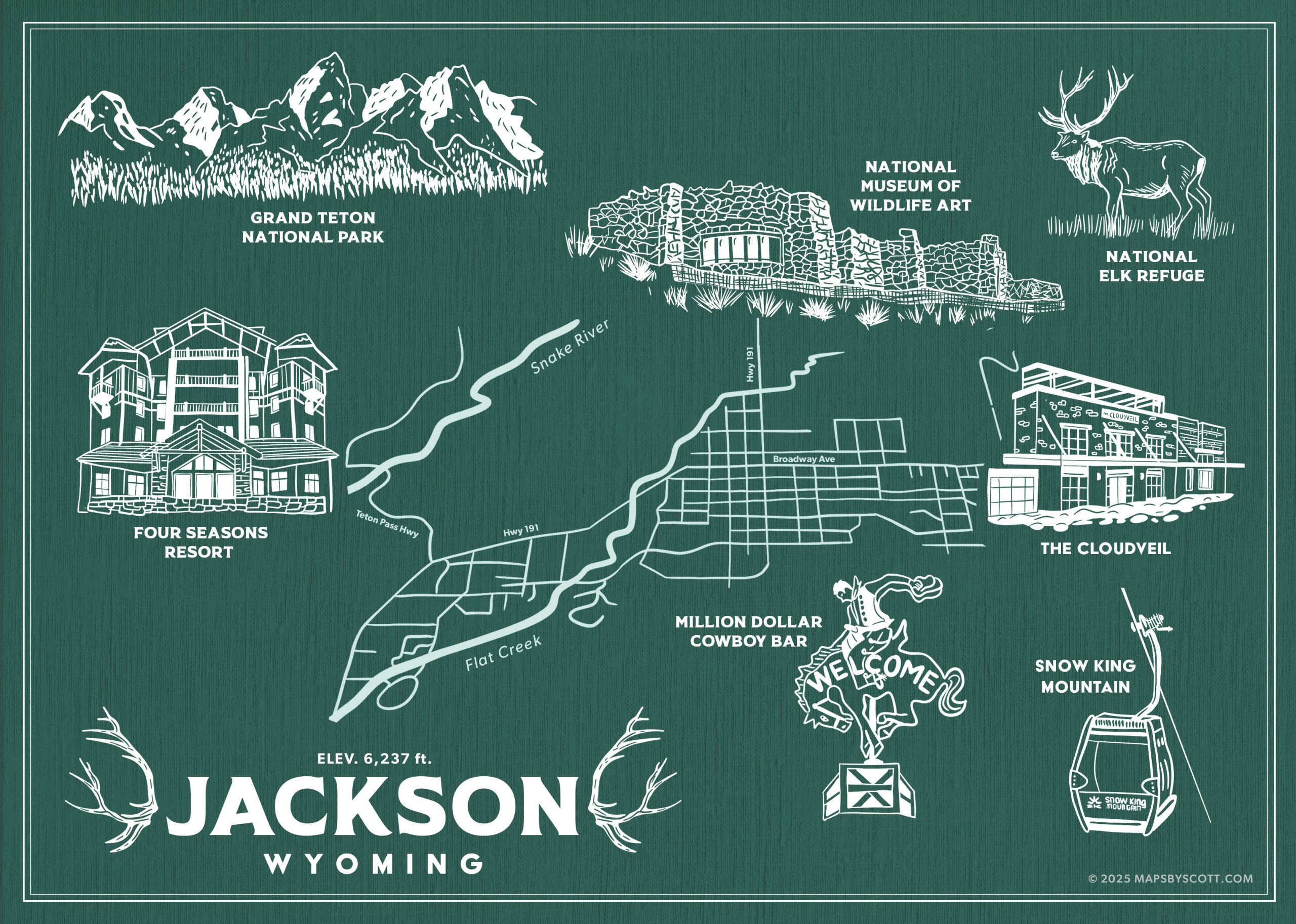 A draft of a souvenir postcard map for a corporate sales event in Jackson, Wyoming. It highlights just a few of the many incredible points of interest that this place is known for. Located just south of Yellowstone National Park, it serves as the gateway to Grand Teton National Park and is one of the premier ski venues and fly fishing destinations in the entire western US.